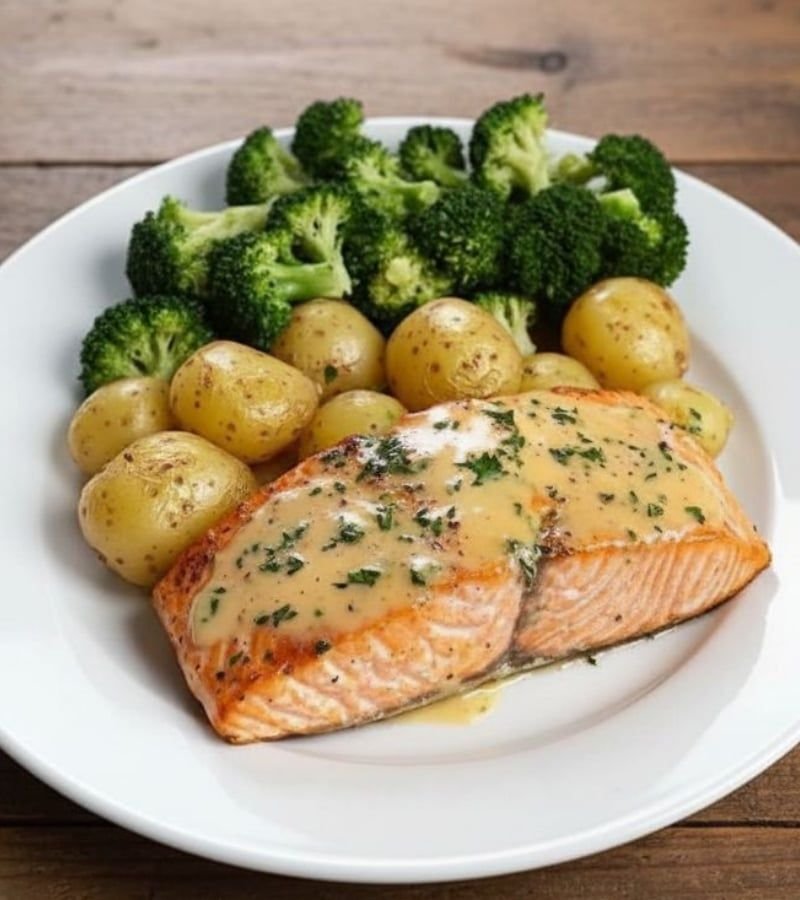 Salmón con mantequilla de limón con patatas crujientes y brócoli